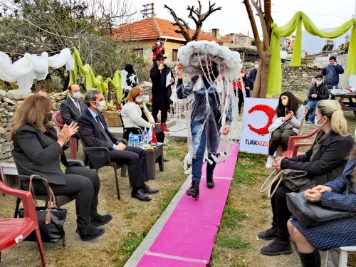 Türk Kızılayı Urla Şubesi’nin “Hayata Bağlan” projesinde gönüllü olarak çalışan engelli anneleri, duş perdesinden, çarşafa, gazete kağıdından plastik tabağa birçok atık malzemelerin tekrar değerlendirilerek tasarladıkları elbiseleri, Türk Kızılayı Urla Şubesi’nin bahçesinde düzenlenen defilede beğeniye sundu.