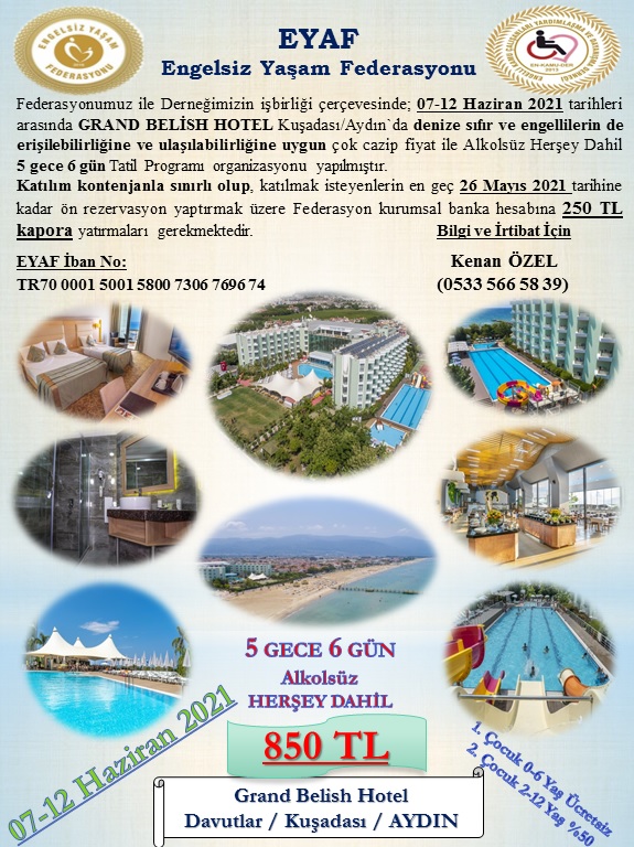 Uzun süredir yürütülen planlama sonucunda Aydın/Kuşadası'da bulunan denize sıfır konumdaki Grand Belish Hotel ile yapılan mutabakat sonucunda, 07-12 Haziran arasında aileler Aydın/Kuşadası'nda denizin keyfini çıkarmaya hazırlanıyorlar. Koronovirüs nedeniyle neredeyse evlerinden hiç çıkmayan Engelli bireyler hem fiziksel hem de psikolojik olarak yorgunluklarını atmak için sabırsızlıkla bekledikleri yaz tatiline çıkmak için gün sayıyor.