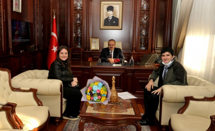 Bursa İşitme Engelliler Derneği Başkanı Şener Baş ve Zeynep Aktan Vali Yakup Canbolat'ı makamında ziyaret etti.